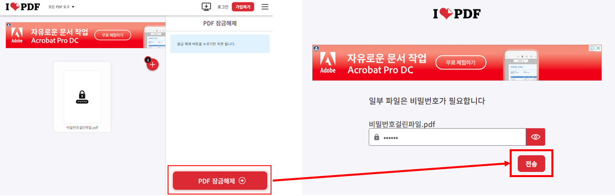 아래 버튼을 클릭하여 회원가입 없이 무료로 PDF 잠금해제를 할 수 있는 ilovepdf에 접속합니다.