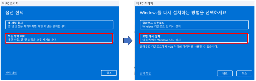 이 때 [모든 항목 제거] -> [로컬 다시 설치] 버튼을 순서대로 클릭합니다.